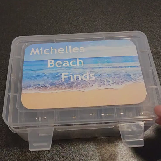 Details: This is a clear beach finds organizer with 14 inner boxes inside the large box. The name on the top is customizable. Choose between internal containers containing identification info or containers with name/image only. Containers have been water resistant sealed to protect the information from the elements. 11 of the containers have labels, 3 are completely blank to use for whatever you would like.