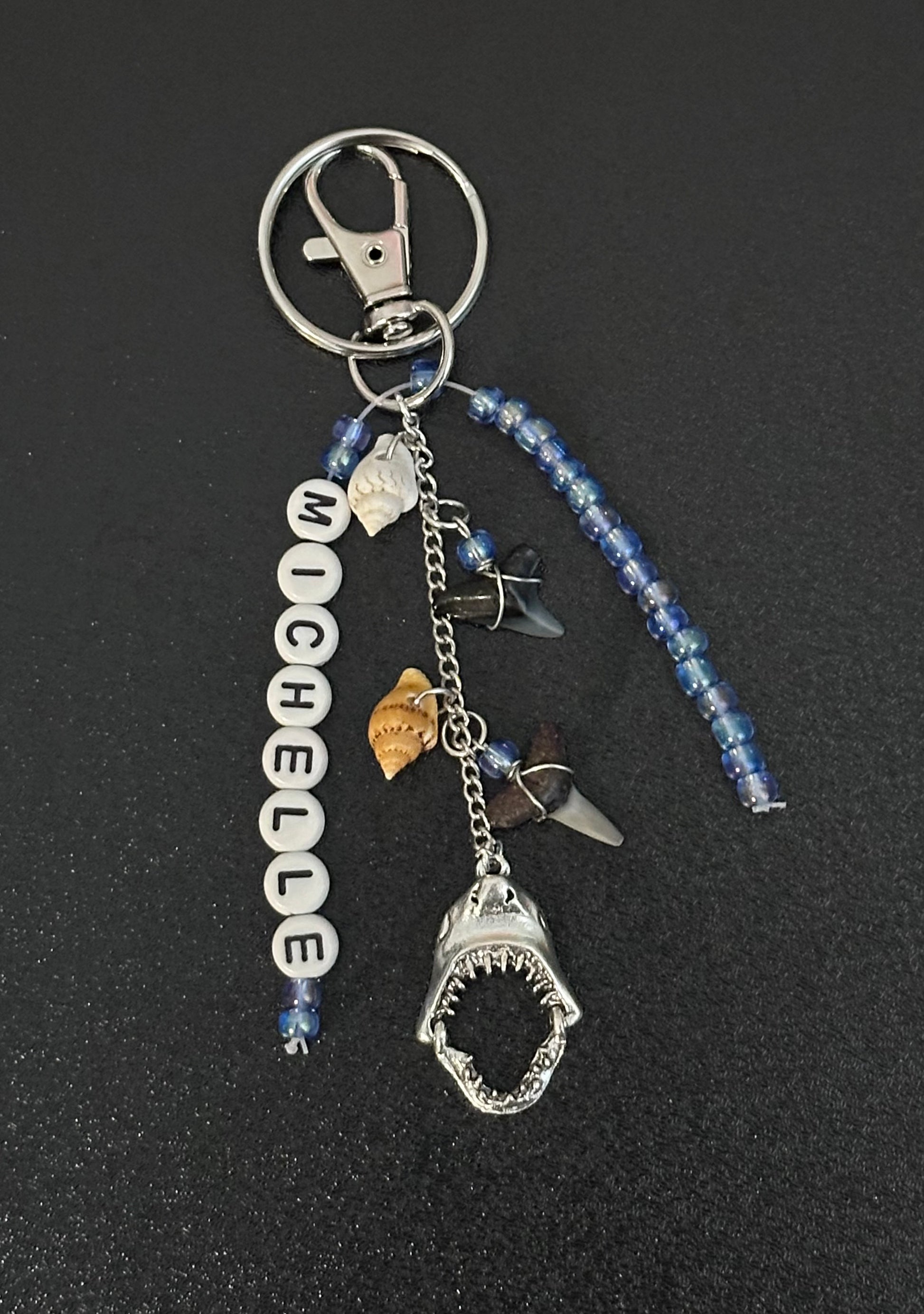 Each keychain will have two sharks teeth from beaches in Southern Florida, two shell charms, and a moveable sharks jaw charm at the bottom.